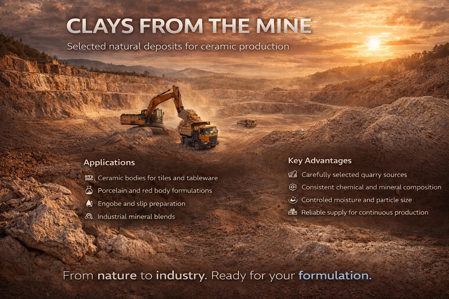 Clays and mineral raw materials from mines such as ball clay, kaolin, feldspar, and chamotte are essential components in ceramic body formulations for tiles, porcelain, and technical ceramics.