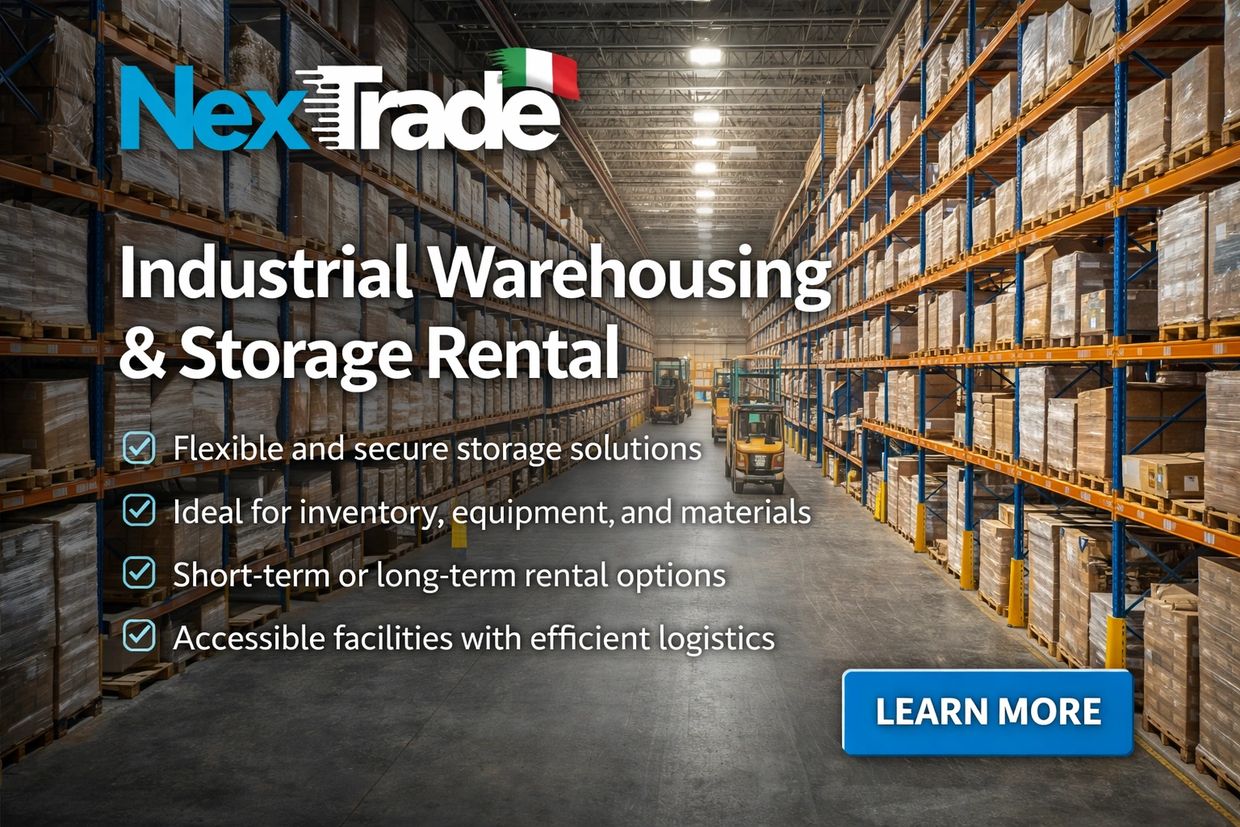 NexTrade also provides dedicated industrial warehouse space in Italy for companies requiring a reliable logistics point to store materials, spare parts, and equipment.