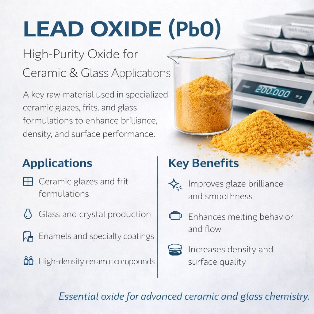 • Lead Oxide (PbO) is widely used in ceramic and glass industries to improve glaze brilliance, melting behavior, and surface smoothness.