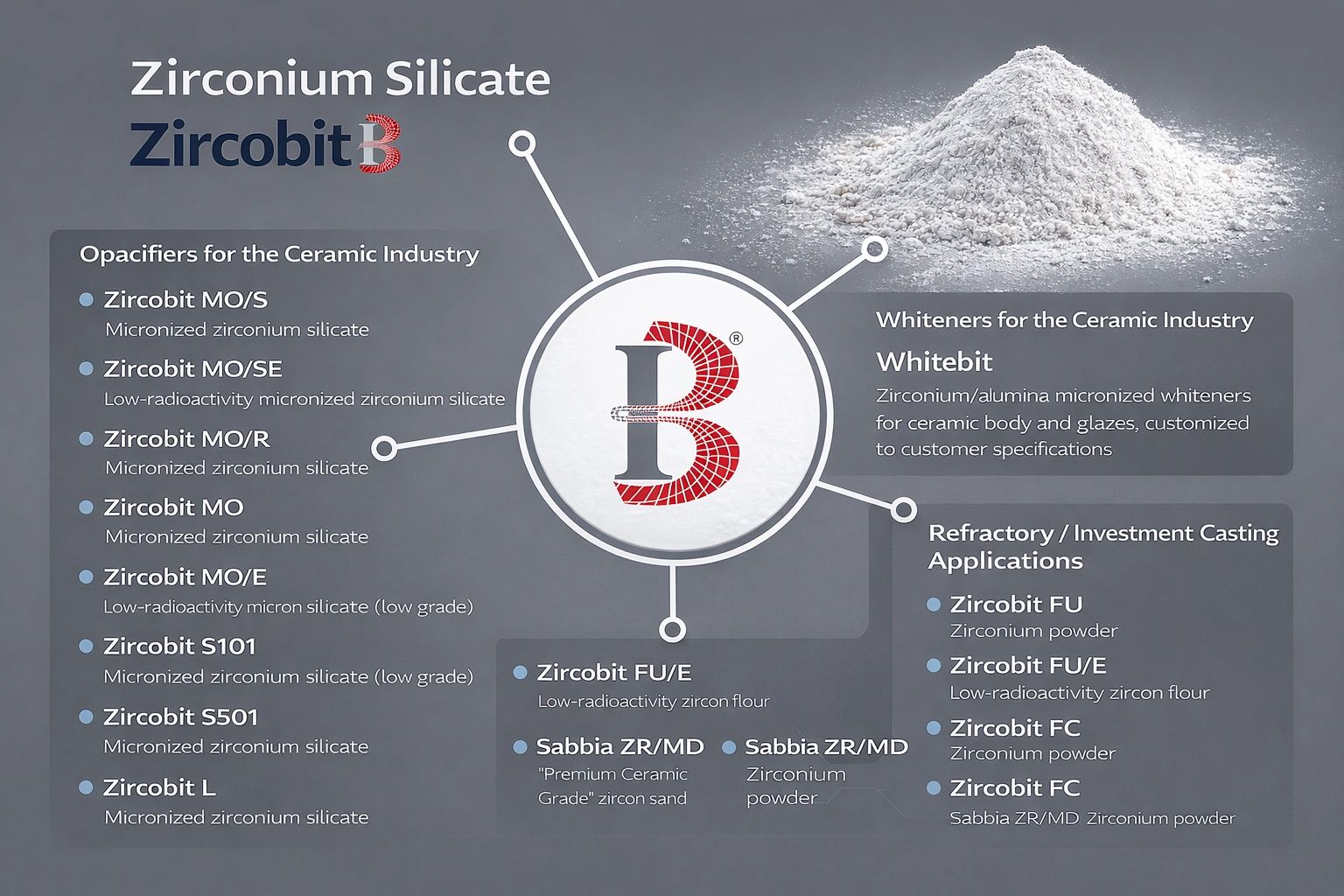 Zirconium silicate is widely used in the ceramic industry as a high-performance opacifier, improving the whiteness, opacity, and covering power of ceramic glazes. Its excellent quality comes from the use of premium Australian and South African zircon sands, combined with advanced processing technologies.